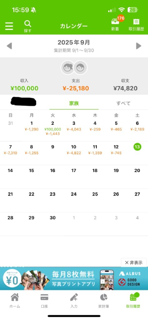 これで家族ページの余りが家庭の貯金、個人ページの余りが個人の貯金として見える化できるようになりました!